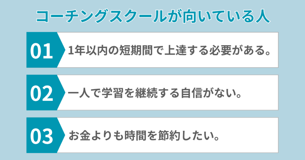 1年以内の目標達成が必要な人は、独学よりもコーチングスクールに通うのがおすすめ。