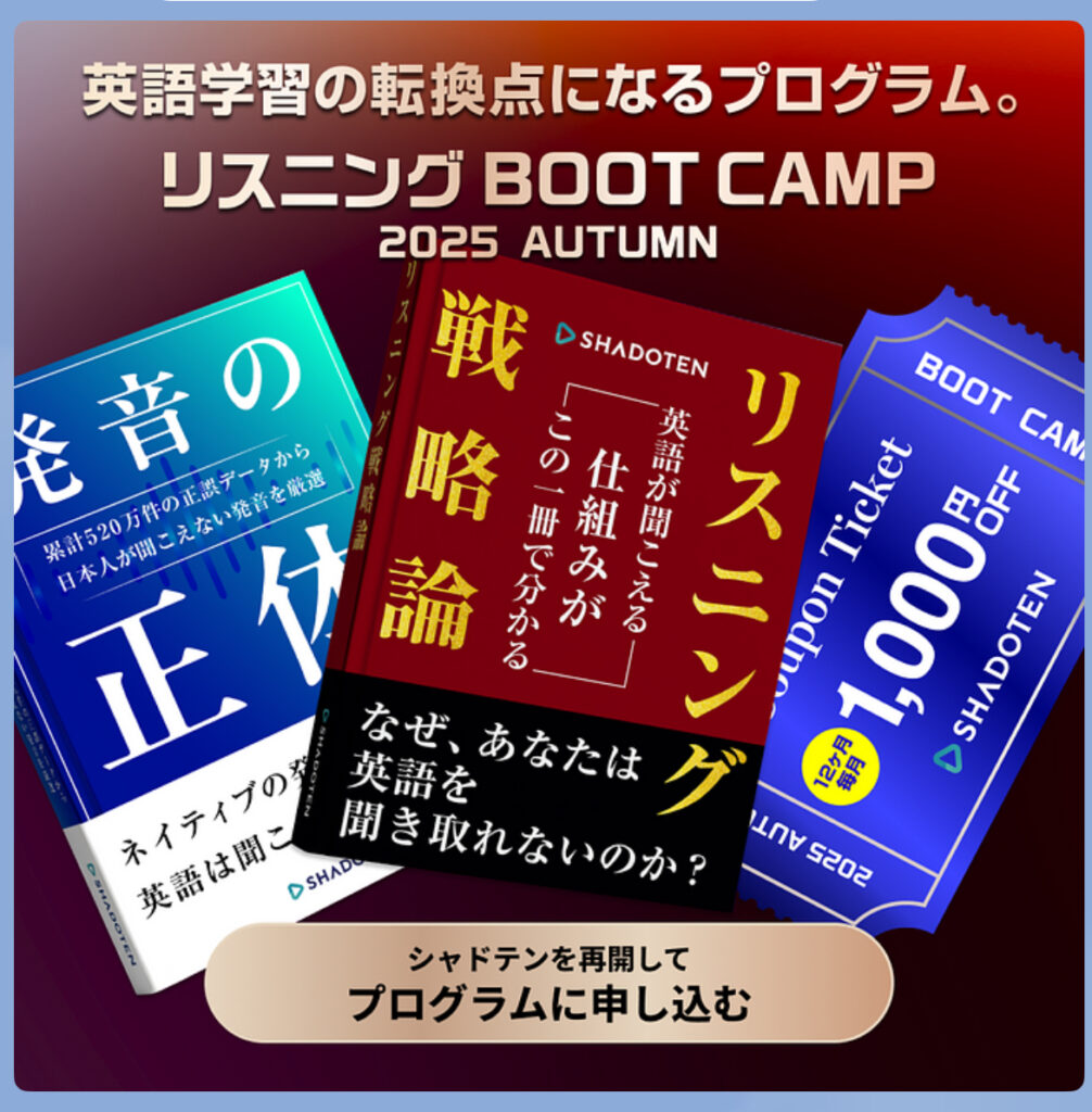 最近では2025年10月に再開者限定の「リスニングBOOT CAMP」を実施。1,000円OFFのクーポンに加えて、学習ノウハウ教材も提供されるお得なキャンペーンとなっていました。