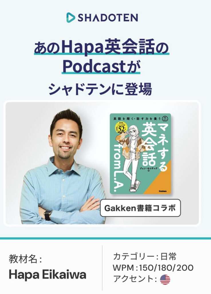 Hapa英会話は、日英バイリンガルのジュン・セニサックさんによる人気ポッドキャスト。その中から人気エピソードを収録した書籍『マネする英会話 from LA』(Gakken刊)の音声の一部が、シャドテンの新教材として追加されました。