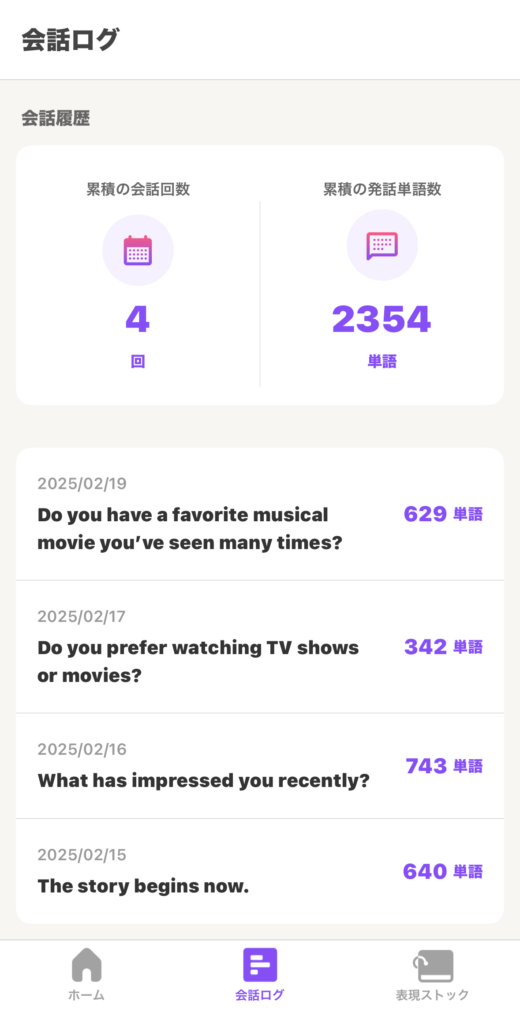 過去の会話はすべて記録され、いつでも振り返れるのが便利です。覚えておきたいフレーズはストックしていつでも見返すことができます。