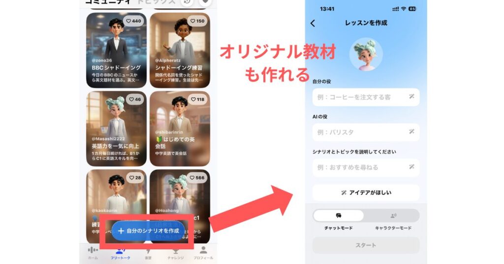 スピークは体系的カリキュラムのレッスンに加えて、フリートークの教材を自分で作成することができます。