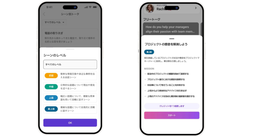 シーン別トークでは、レベルに応じたテーマが用意されています。リアルなシチュエーションで会話のシミュレーションができます。