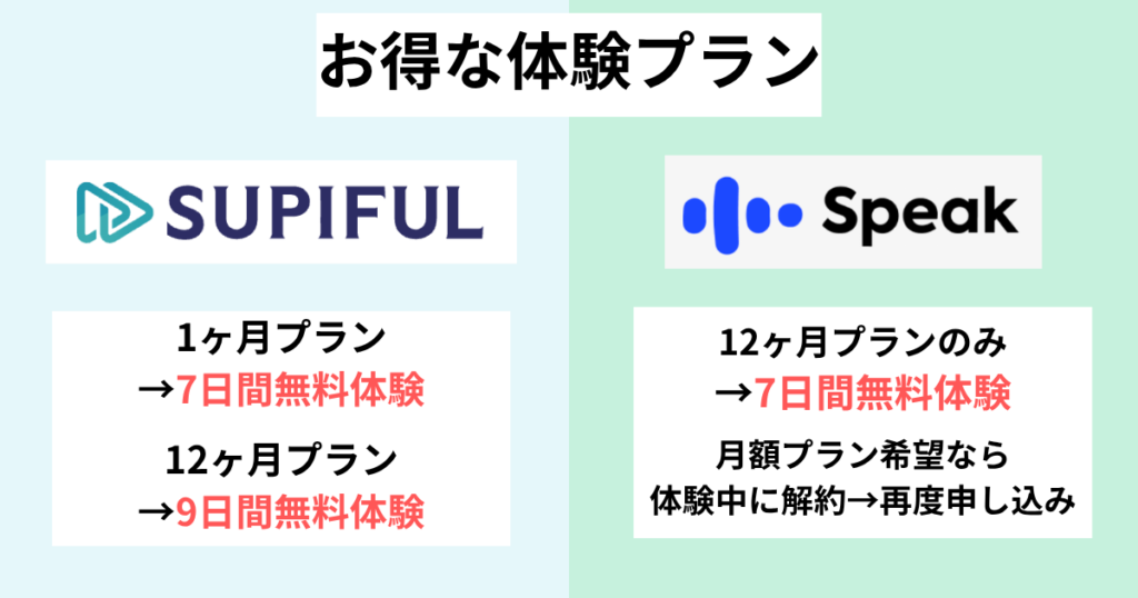 どちらが良いか決めかねる人は、まずはスピークをお試ししてみましょう。気に入ればそのまま継続し、しっくりこないならスピフルを無料体験してみてください。