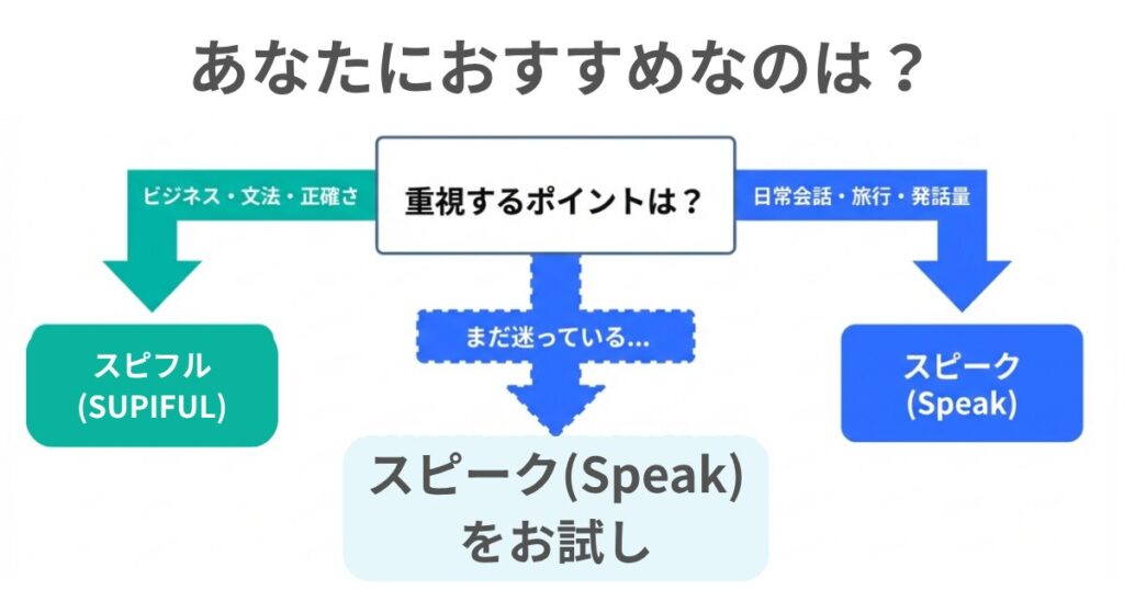 スピフルとスピークのどちらが良いか迷っている方に、まずは結論からお伝えしましょう。皆さんはどちらに当てはまるでしょうか?